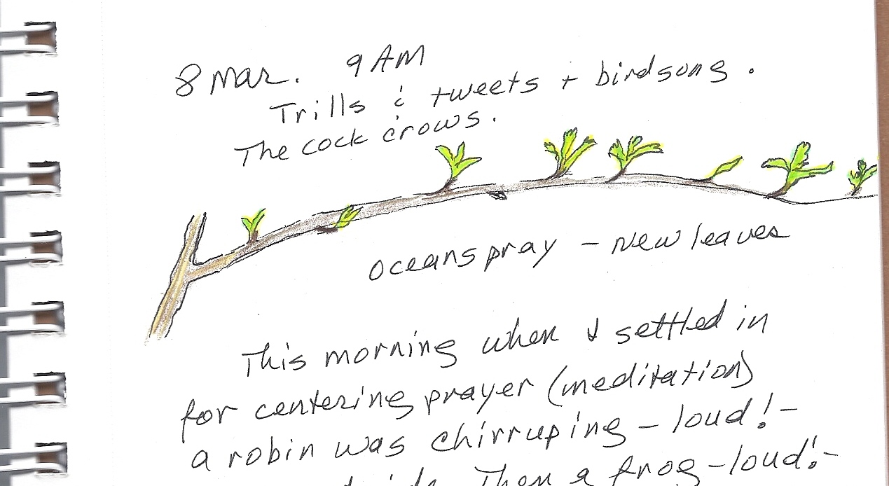 This morning when I settled in for centering prayer (meditation), a robin was chirruping — loud! — just outside. Then a frog — loud! — started to croak, I swear in time with the chirrups. As if answering back.