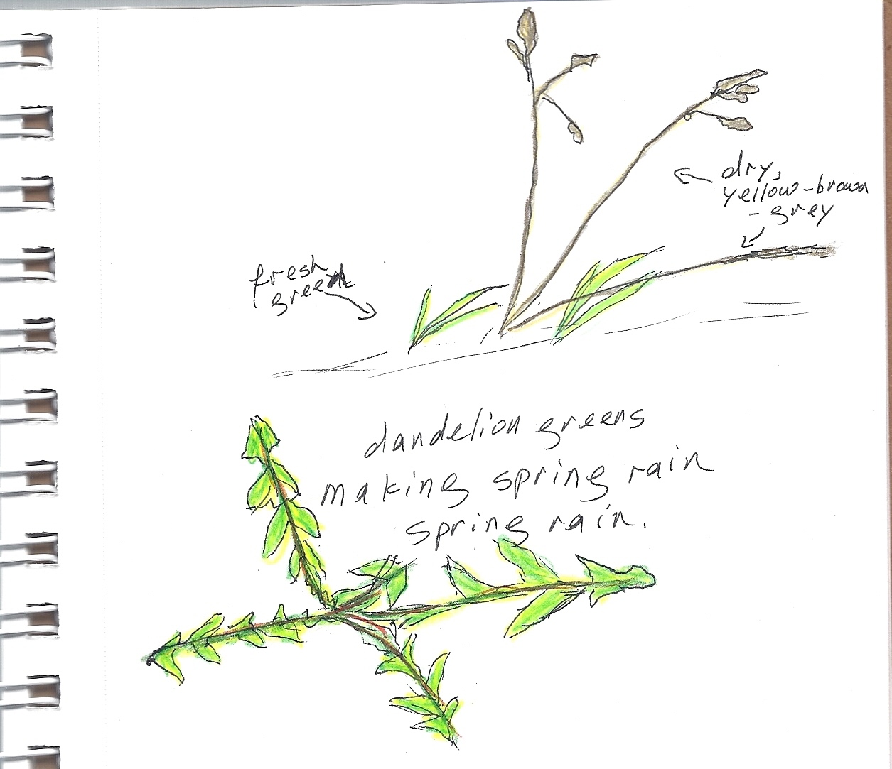 Last year’s grass and this year’s grass share the meadow. Dandelion greens spring into life.
