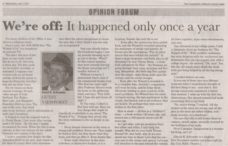 The Courtyard is grateful to David H. Schroeder for permission to reprint his reflections on “The Wizard of Oz.” Here’s how it appeared in the Port Townsend Leader on July 7, 2021.